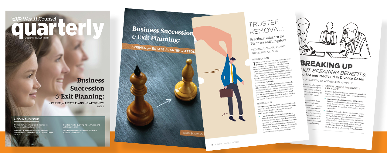 The WealthCounsel Quarterly is the premier legal magazine for estate planning and elder law attorneys. Subscribers get access to the latest digital issue that includes informative articles written by industry leaders, practice development tips, and WealthCounsel’s full educational calendar for the quarter.